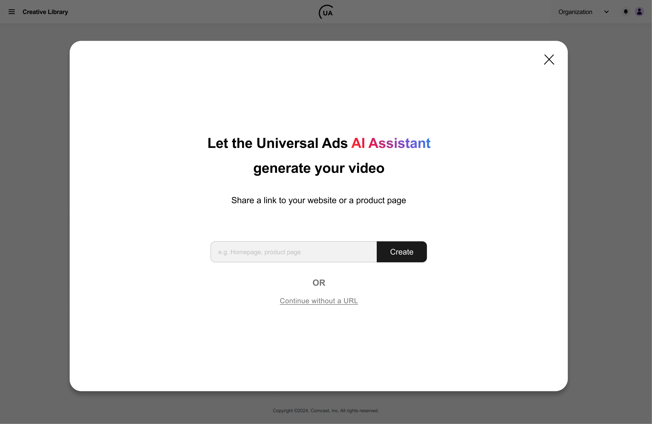 - In the provided field, enter the URL of your business website, product catalog, or e-commerce page (e.g., Amazon or Shopify), then click Create. The tool will begin reviewing and extracting assets from the site. This may take a few minutes.