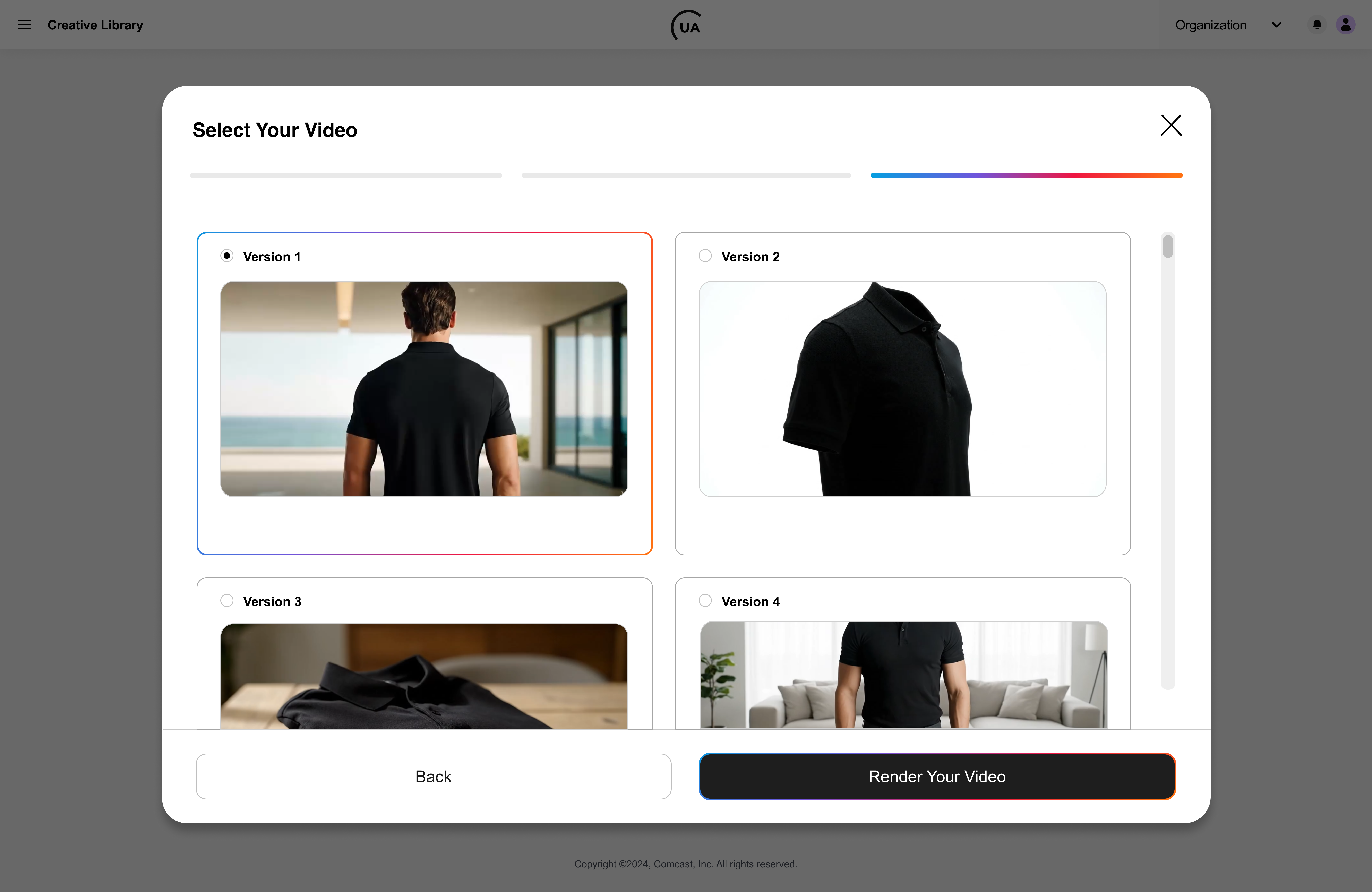 - Preview each video to evaluate how well it represents your brand and choose one video to fully render.