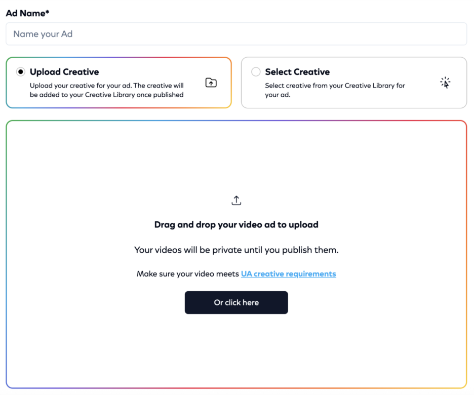- Drag and drop, click to upload creative from your computer or select a creative from your Creative Library.