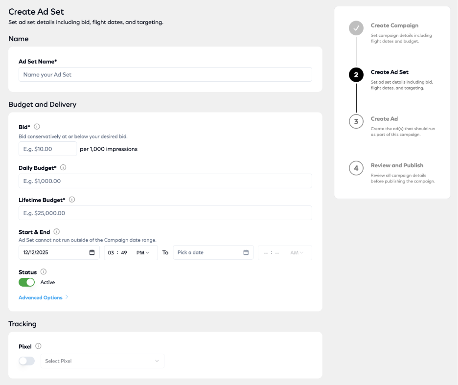 - Select Advanced Options to include a frequency cap: a limit to how many times a viewer sees your ad during a specific period or dayparting (link to article)