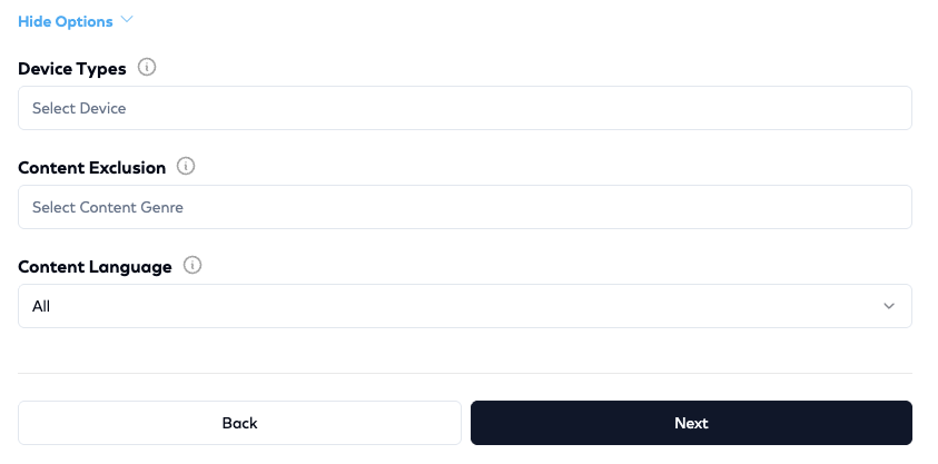 - Select Advanced Options to target by device types, content language or exclude certain content genres